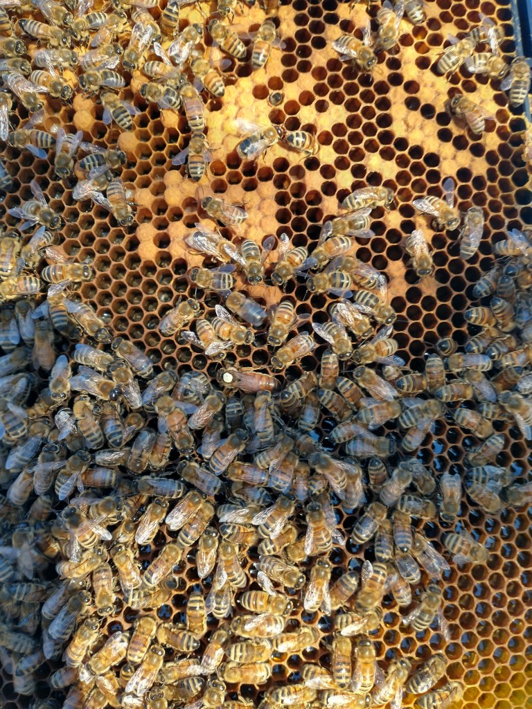 IMG_20211018_141426793_HDRIt is not unusual for hives to try to replace a new queen. During that first hive inspection after installing her majesty, I again found supersedure cells. I cut them out, and scolded my workers a bit. During the first weekend of November, I was doing a hive inspection on an unseasonable 70-degree day, and found a swarm cell—with a larva in it—on the bottom of one frame. That there was only one, and that it was there so late in the season was confusing, and frustrating to me. Before I could even decide what to do, I accidentally smashed it while moving the box it was in. My latest, and last, hive inspection showed no signs of them trying to replace Queen Leslie II, who is still laying like a champ. I expect that as the temperature drops, she will slow down. In the meantime, it has been an absolute treat to have a marked queen. I can always find the queen now and I am delighted every time I see her.