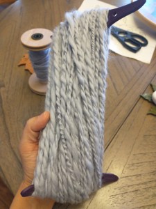 I am learning how to spin. After almost a year with little progress, I decided that I needed to put a deadline on myself to get the ball rolling, or the spindle spinning, rather. I decided to use the pretty merino fiber I had to make Christmas gifts for my grandparents. I was really pleased with how my first two yarns turned out, but I got less than a third of the way through knitting a cabled headband before I was out of yarn. That’s when I learned how to measure a skein using a niddy noddy, and discovered that I had only spun ~30 yds out of 4 oz of fiber. Yikes. I had to learn to spin thinner!